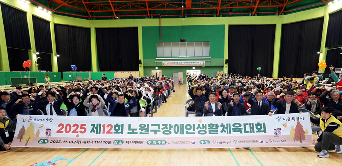 오승록 서울 노원구청장이 최근 육군사관학교 체육관에서 열린 ‘제12회 노원구 장애인생활체육대회’에 참석해 선수단을 격려했다. 대회에는 오승록 노원구청장을 비롯해 참가선수, 운영진, 임원 및 내빈 등 약 450여명이 함께했다. 사진은 오 구청장이 대회에 참석해 기념 촬영을 하는 모습. (사진=노원구청 제공)