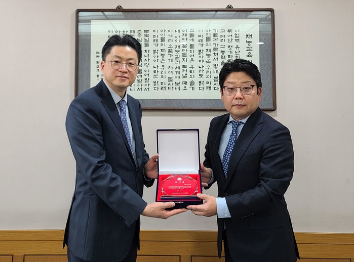 | ▲ 한국영재학회 이재호 회장(오른쪽)이 재능교육 박종우 대표(왼쪽)에게 감사패를 수여하고 있다. (사진제공=재능교육) |