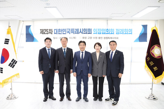 이날 회의에는 유진선 의장을 비롯해 김운남 고양특례시의회 의장, 배정수 화성시의회 의장, 이재식 수원특례시의회 의장, 손태화 창원특례시의회 의장 등 관계자들이 참석했다.