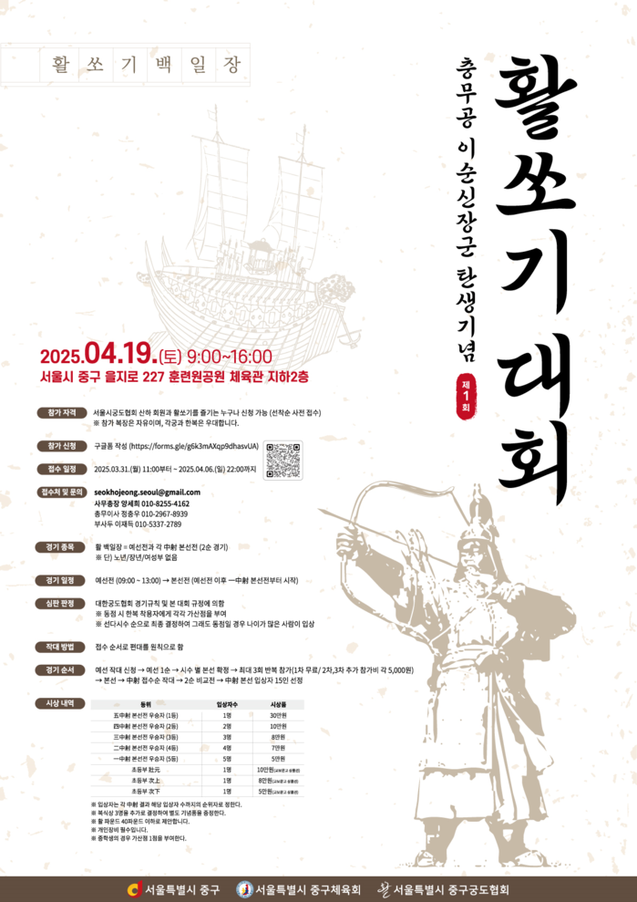 구 관계자는 “충무공 이순신 장군의 탄생일을 기념해, 장군의 삶과 맞닿은 훈련원공원에서 활쏘기 대회를 열게 돼 뜻깊다”라며 “이순신 장군이라는 위인의 시작점인 중구를 널리 알리고, 구민의 자긍심을 높이는 계기가 되길 바란다”라고 말했다.