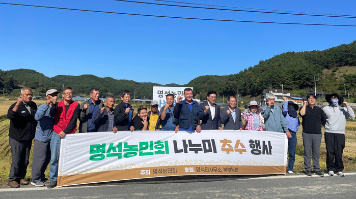 명석면 농민회의 ‘나눔 쌀’을 수확은 올해로 3회째이며, 이번 행사에는 30여 명의 회원이 참석하여 총 3,612㎡ 면적의 벼를 수확하였다. 경작 과정에서 진주북부농협과 명석면 농약사가 육묘 및 제초제를 지원하여 지역사회 상생의 의미를 더했다.