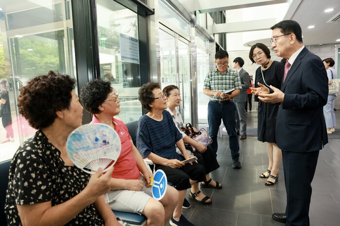 | ▲ 리모델링 사업을 마치고 재개관한 구로구민체육센터에서 만난 주민들과 이야기를 나누고 있는 문헌일 구로구청장 (사진=구로구청 제공) |