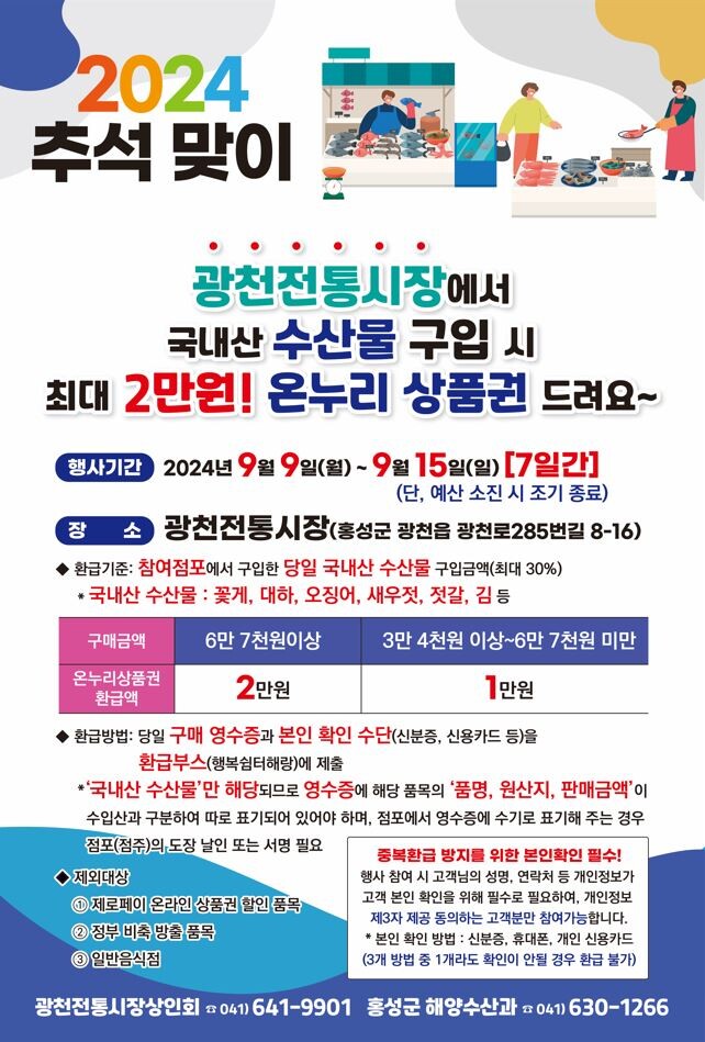 1주일간 광천전통시장내 행사참여점포 72곳에서 진행되며, 국내산 수산물 구매시 최대 30%(1인당 2만원 한도)를 온누리상품권으로 환급해 준다.