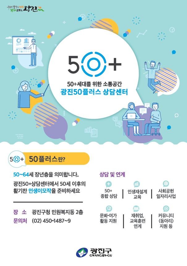 50+상담센터는 50+세대(만 50~64세)의 새로운 인생 준비와 성공적인 노후생활을 지원하는 곳으로, 광진구청 민원복지동 2층에 위치하고 있다.