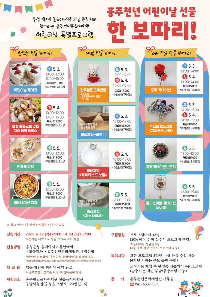 이번 프로그램에는 ▲어린이들이 좋아하는 케이크. 치즈돈까스, 피자를 만드는 맛있는 선물 보따리 ▲한복 입은 모루인형과 물레로 도자기를 만드는 예쁜 선물 보따리 ▲부모님들께 선물로 드릴 수 있는 모루ㆍ자개ㆍ글라스아트 카네이션 ▲양말목 안마봉 만들기로 구성된 어버이날 선물 보따리가 준비돼 있다.