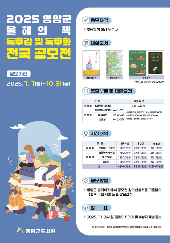 제1회로 열리는 이번 공모전은 영암군 독서문화를 알리고, 책을 매개로 전국 독서가들과 교류하기 위해 마련됐다.