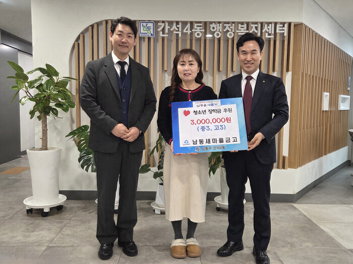 [인천=문찬식 기자] 인천 남동구 간석4동 행정복지센터는 최근 남동새마을금고로부터 저소득 가정 자녀 장학금 300만원을 후원받았다고 19일 밝혔다.