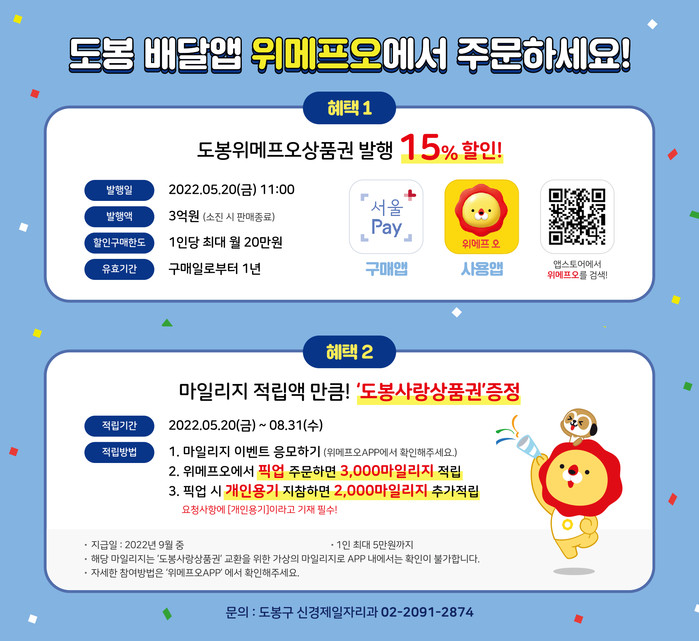 3억원 규모로 발행된 '도봉위메프오상품권'은 도봉형 민간주도 배달앱 '위메프오'의 전용상품권으로 1인당 월 20만원까지 서울페이+ 앱에서 구매 가능하며, 구는 지난 20일부터 오는 8월31일까지 15% 할인 발행과 더불어 마일리지 적립 이벤트를 진행 중이다.