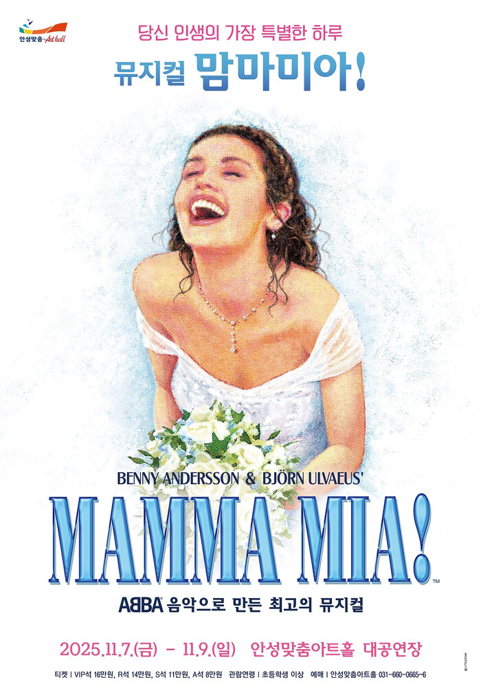 유쾌한 웃음과 아바(ABBA)의 명곡이 어우러진 뮤지컬<맘마미아>의 티켓가는 VIP석 16만원, R석 14만원, S석 11만원, A석 8만원이며 안성 시민은 20%할인 혜택을 받을 수 있다. 공연에 대한 자세한 정보는 안성맞춤아트홀 홈페이지를 참고하거나 안성맞춤아트홀로 문의하면 된다.