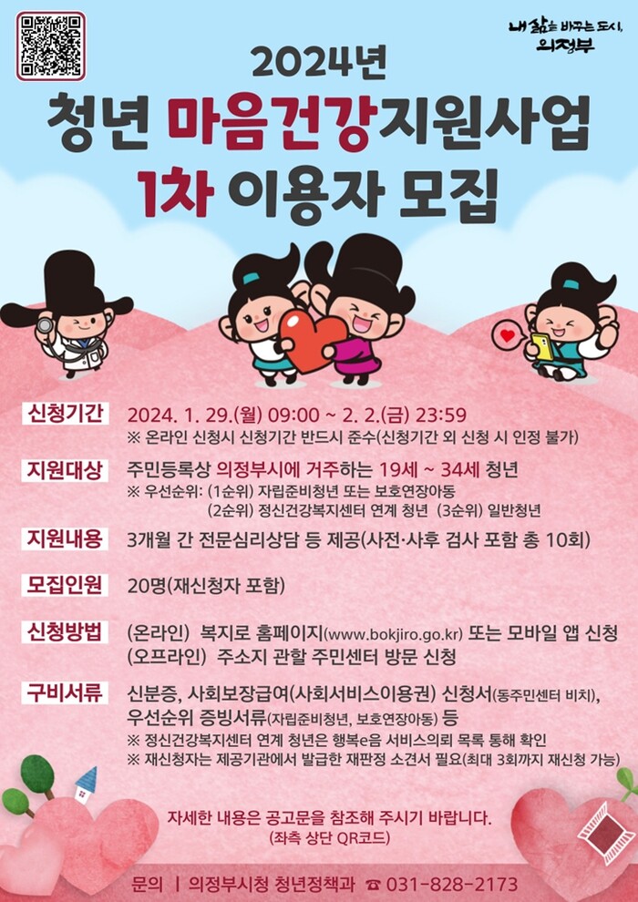 [의정부=최문수 기자] 경기 의정부시가 오는 29일부터 2월2일까지 심리정서 지원이 필요한 청년을 위한 ‘2024년 청년 마음건강지원사업’ 이용자를 모집한다.