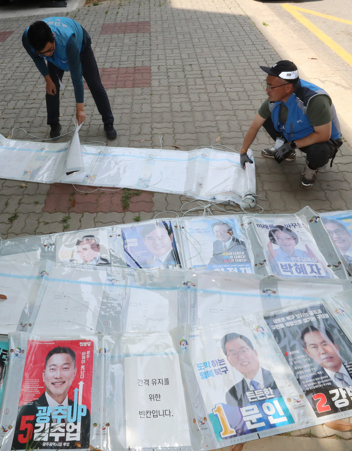 제8회 전국동시지방선거가 종료된 2일 오전 광주 북구 일곡동의 한 거리에서 광주광역시옥외광고물협회 관계자들이 선거 벽보를 철거하고 있다.