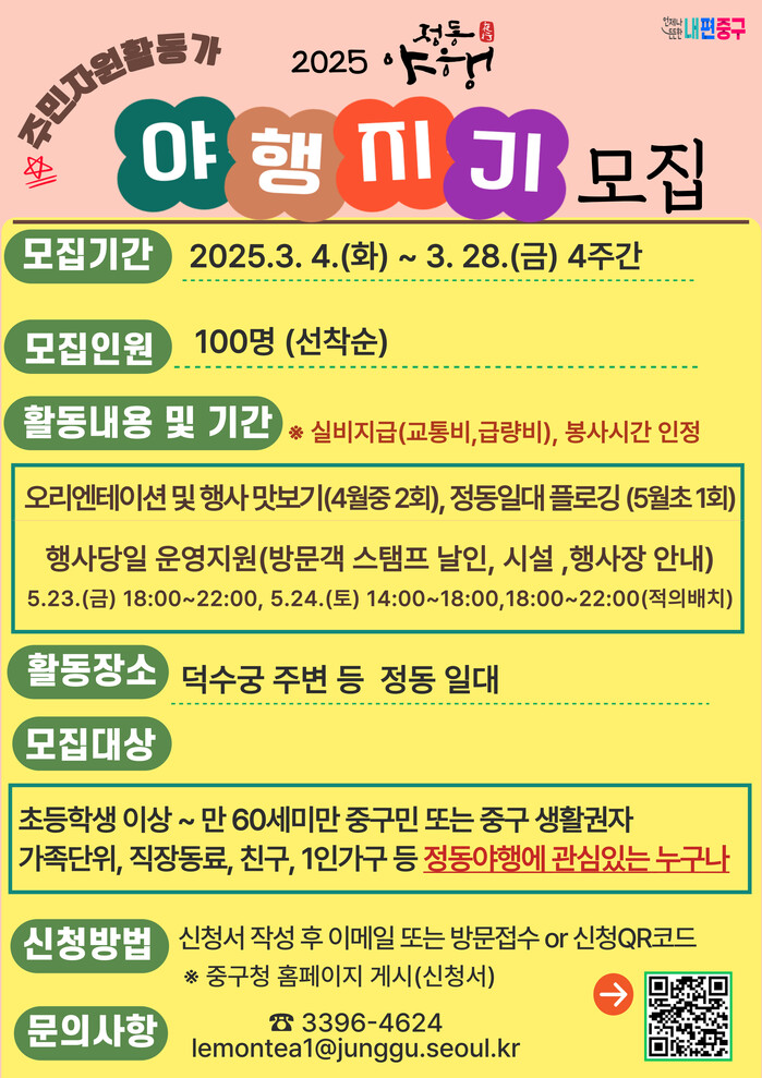 [시민일보 = 여영준 기자] 서울 중구가 역사문화 야행 축제인 '2025 정동야행'을 함께 만들어 갈 주민자원활동가 <야행지기>를 모집한다.