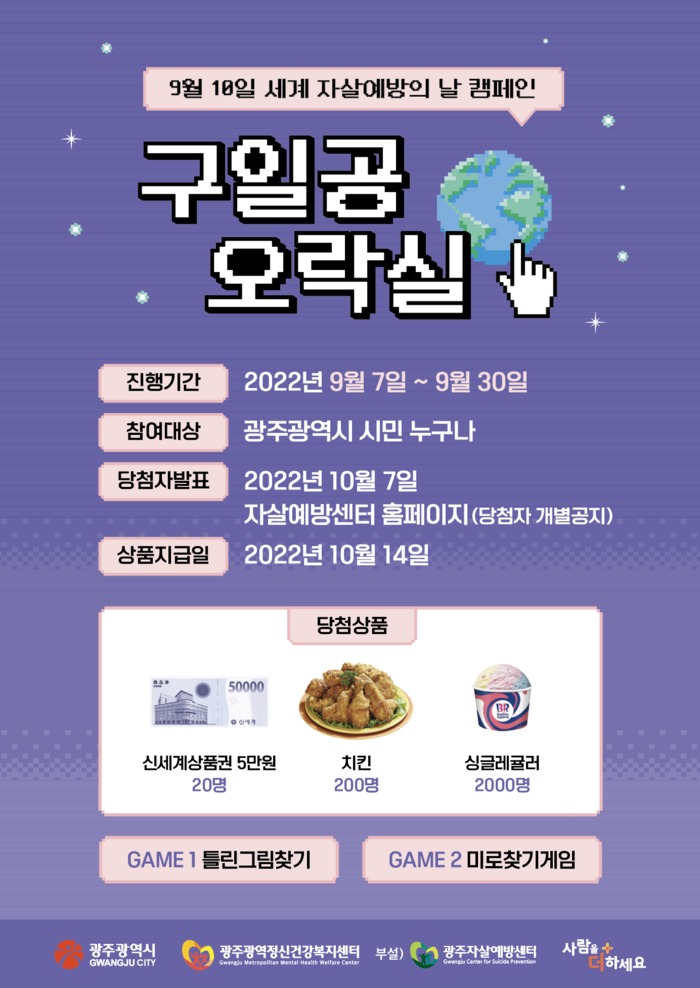 ‘구일공 오락실’을 주제로 진행되는 이번 캠페인은 세계 자살예방의 날과 광주시 자살예방 지원사업을 홍보하기 위해 마련됐다.