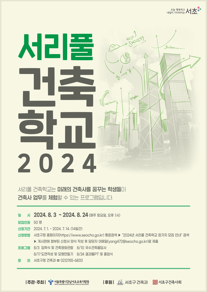 전성수 구청장은 “건축에 관심이 많은 학생들을 위해 우수 건축물을 탐방하고, 실제 건축사 업무도 체험해 볼 수 있는 프로그램을 준비했다”며 “이번 서리풀 건축학교가 학생들의 진로 선택에도 큰 도움이 되기를 기대한다”라고 말했다.