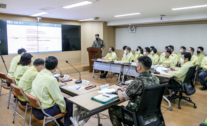 강서구는 지난 22일 민·관·군·경 등 관계자 70여명이 참석한 가운데 ‘을지훈련 최초보고회’를 열었다. 사진은 이날 을지훈련 최초보고회가 진행되고 있는 모습. (사진제공=강서구청)