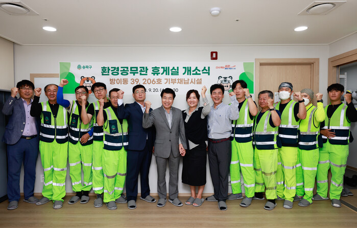방이동 새 휴게실은 74㎡ 규모로 샤워실, 세탁실, 주방과 휴식공간 등을 갖췄으며, 지난 20일 기부채납시설 환경공무관 휴게실 개소식을 열고 운영에 들어갔다.