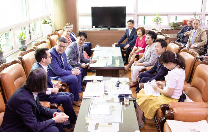 [안산=송윤근 기자] 경기 안산시의회 의장단이 5일 시의회를 방문한 독일 아헨특구시 경제사절단을 접견하고 양 도시의 우호 협력 방안을 협의했다.
