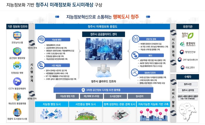 용역을 맡은 나눔아이씨티(주)는 내·외부 환경 분석과 지역정보화 전문가, 시민, 공무원 등 정보화 설문조사 및 인터뷰를 바탕으로 ‘지능정보혁신으로 소통하는 행복도시 청주’를 비전으로 정했다.