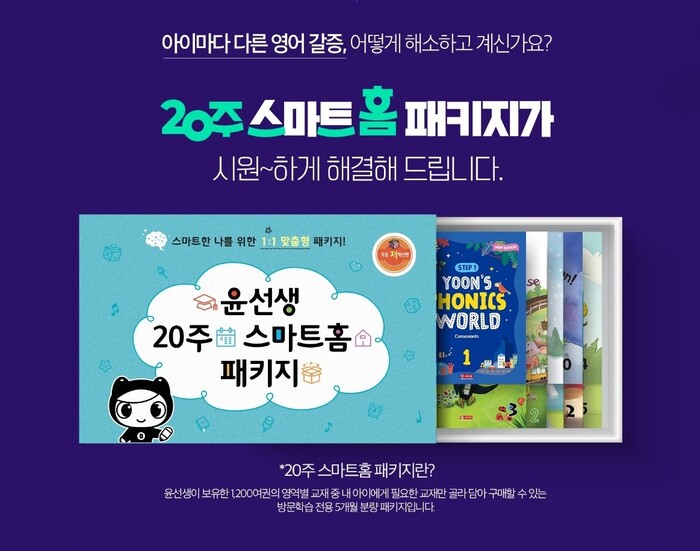 윤선생에 따르면 20주 스마트홈 패키지는 윤선생이 보유한 1200여 권의 영역별 교재 중 자녀에게 필요한 교재만 골라 학습할 수 있는 DIY 영어학습 상품이다. 기존 방문학습 프로그램이 아이 수준에 맞춰 정규 커리큘럼 순으로 학습한다면, 이 상품은 학부모 및 학생이 전문 교사와 상의해 학습 교재를 직접 선택할 수 있는 것이 차별점이다.