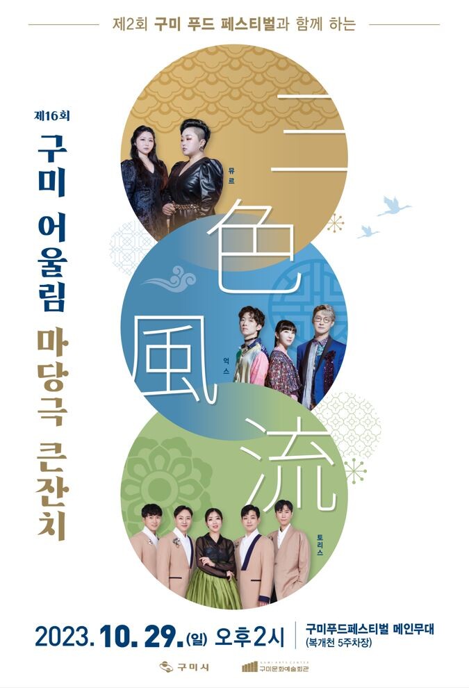 ‘구미푸드페스티벌’과 함께하는 이번 '삼색풍류(三色風流)' 공연은 국악×재즈, 국악×아카펠라, 국악×록(Rock)의 크로스오버 무대로 세 가지 매력의 풍류 한마당을 펼친다.