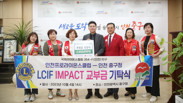 [인천=문찬식 기자] 인천 중구는 최근 국제라이온스협회 354-F(인천)지구 제3지역 프로클럽으로부터 후원금 230만원을 전달받았다고 5일 밝혔다.