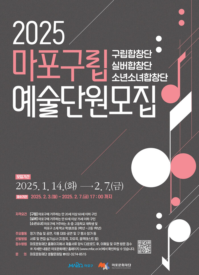 [시민일보 = 문민호 기자] 서울 마포구(구청장 박강수)가 마포구립예술합창단원을 오는 7일까지 모집한다.