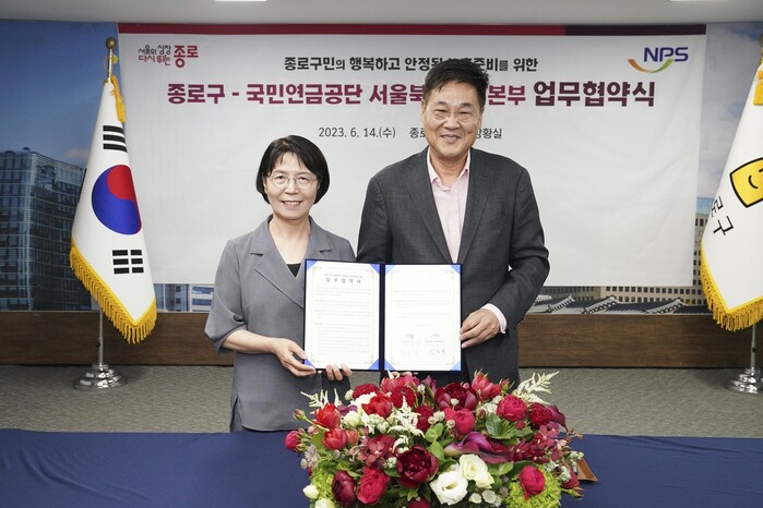 [시민일보 = 이대우 기자]서울 종로구(구청장 정문헌)가 최근 국민연금공단 서울북부지역본부과 구민의 행복한 노후 준비 지원을 위한 업무협약을 체결했다.