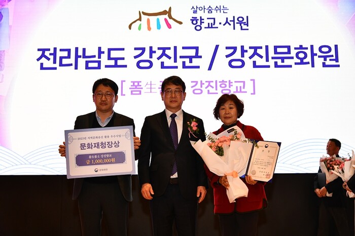 | ▲ 2023년 강진향교 활용 사업 수상 사진/ 왼쪽부터 왼쪽부터 강진군 이세옥 팀장, 최응천 문화재청장, 강진문화원 강경애 팀장 순. / 강진군 제공 |