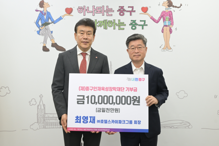 [시민일보 = 여영준 기자] 서울 중구(구청장 김길성)는 최근 구청장실에서 (주)호텔스카이파크그룹이 서울중구장학재단(이하 재단)에 지역 인재 육성을 위한 장학금 1000만원을 기탁했다고 24일 밝혔다.
