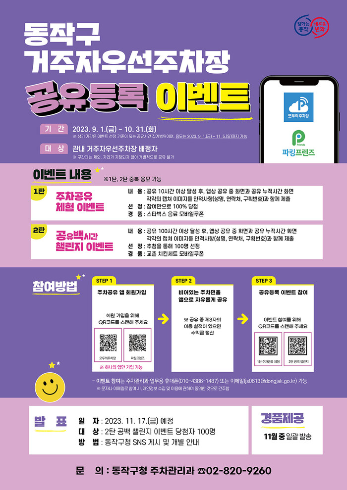[시민일보 = 여영준 기자] 서울 동작구(구청장 박일하)는 주차난 해소 및 공유주차 문화 확산을 위해 오는 9~10월 거주자우선주차장 공유 이벤트를 진행한다고 28일 밝혔다.