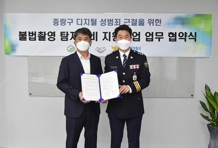 서울 중랑구는 3일 지역내 디지털 성범죄 근절을 위해 중랑경찰서와 불법 촬영 탐지장비 지원사업 업무협약을 맺고 각 지구대와 파출소에 불법 촬영 탐지장비 총 16세트를 전달했다. 사진은 협약식에서 김태희 구청장 권한대행(왼쪽)과 유보현 중랑경찰서 여성청소년과장이 기념촬영을 하고 있는 모습. (사진제공=중랑구청)