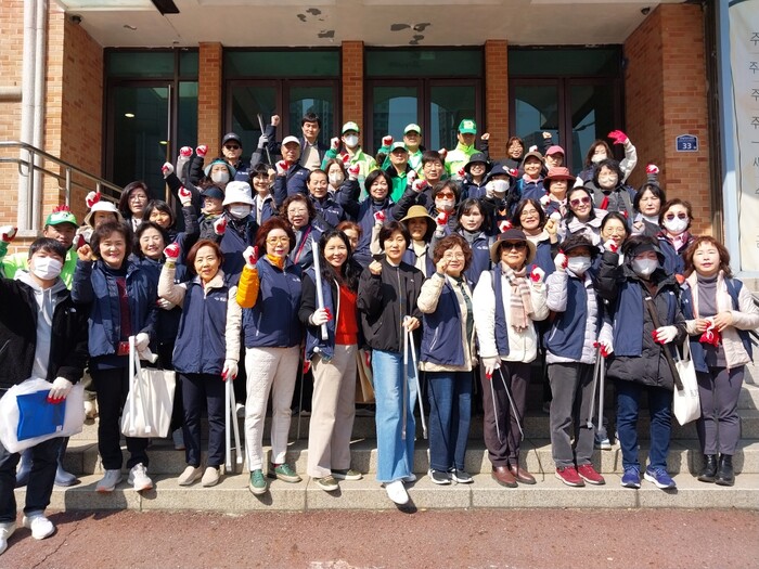 경기 수원시 영통구 광교1동은 14일 새봄을 맞이해 통장협의회 회원들과 함께 지역내 환경정비 및 지역순찰을 진행했다. 이날 참여자들은 유동인구가 많은 여천변 및 주요 도로변의 각종 쓰레기를 수거했다. 사진은 참여자들이 기념촬영을 하고 있는 모습. (사진=영통구청 제공)