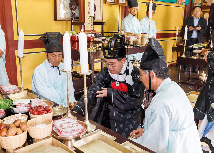 진교훈 서울 강서구청장이 지난 24일 서울 유일의 향교인 양천향교 ‘춘기 석전제’에 초헌관으로 참여해 옛 성현들을 기리며 제례를 올렸다. 사진은 진 구청장(가운데)이 제례를 올리는 모습. (사진=강서구청 제공)