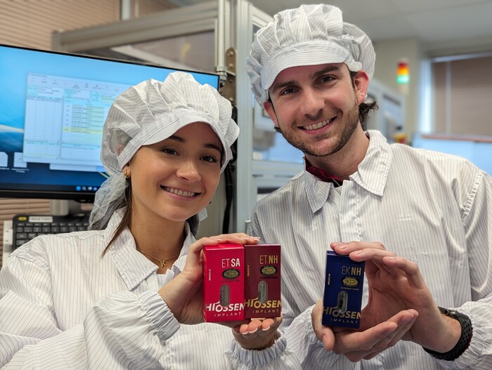 | ▲ 오스템임플란트 미국법인 생산본부 직원들이 새롭게 디자인된 자사 하이오센 임플란트 제품을 들고 웃고 있다. (사진= 오스템임플란트 제공) |