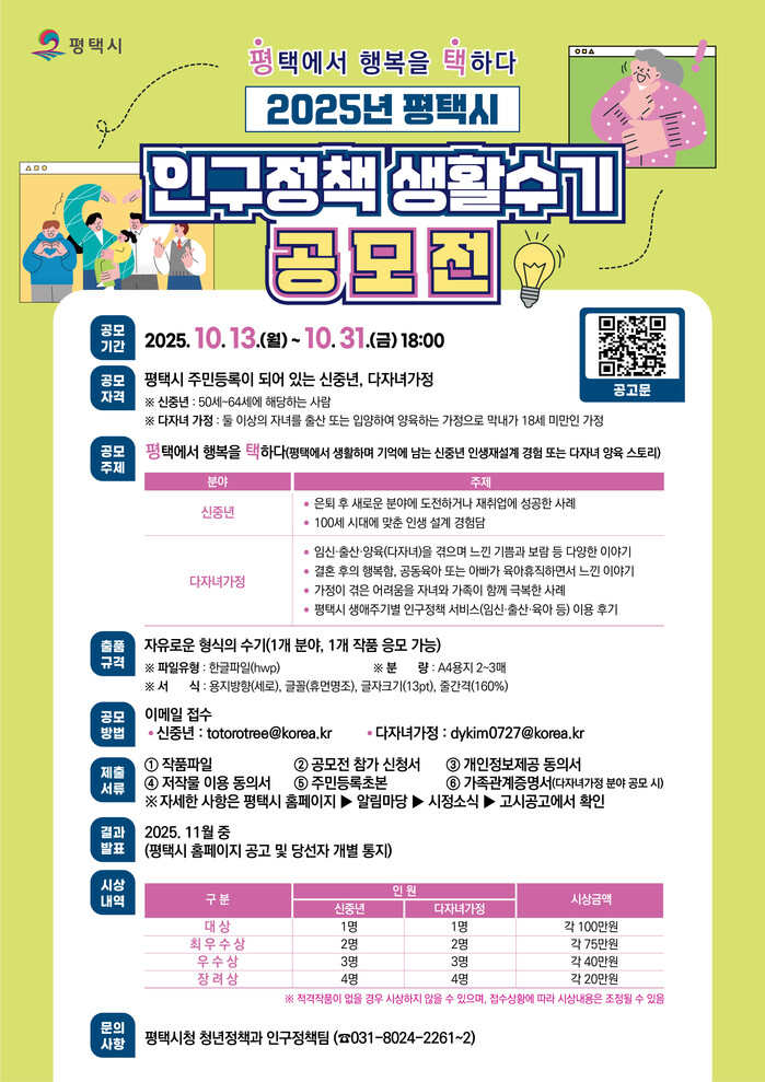 [평택=오왕석 기자] 평택시(시장 정장선)는 2025년 평택시 인구정책 생활수기 공모전 ‘평택에서 행복을 택하다’를 오는 10월 31일까지 개최한다고 밝혔다.