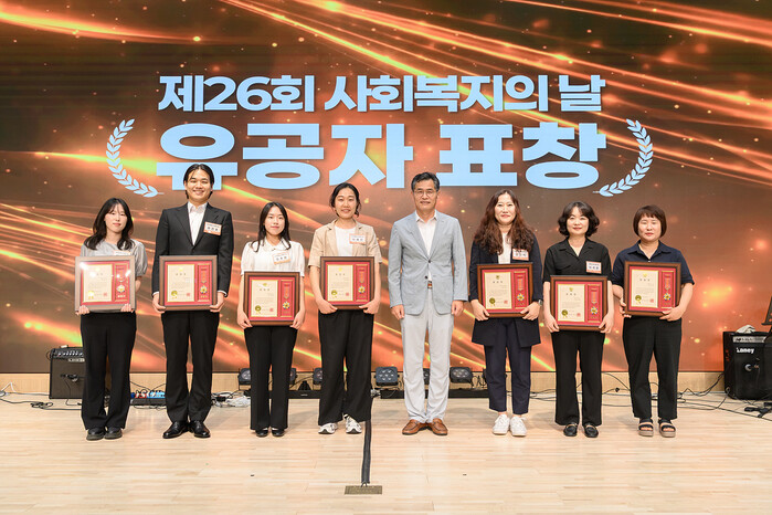 서울 양천구가 사회복지의 날을 맞아 8일 양천디지털미디어센터에서 기념행사를 개최했다. 이번 행사에는 이기재 구청장을 비롯해 지역내 사회복지 시설 종사자, 관계기관, 주민 등 약 150여명이 참석했다. 사진은 이 구청장(오른쪽 네 번째)이 유공자 표창 후 기념 촬영을 하는 모습. (사진=양천구청 제공)
