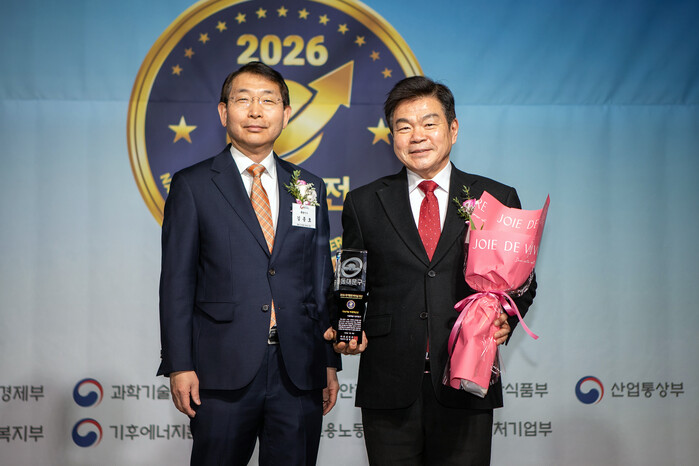 | ▲ ‘2026 국가발전 리더십 대상’ 시상식에 참석한 이필형 구청장(왼쪽)이 기념촬영을 하고 있다. (사진=동대문구청 제공) |
