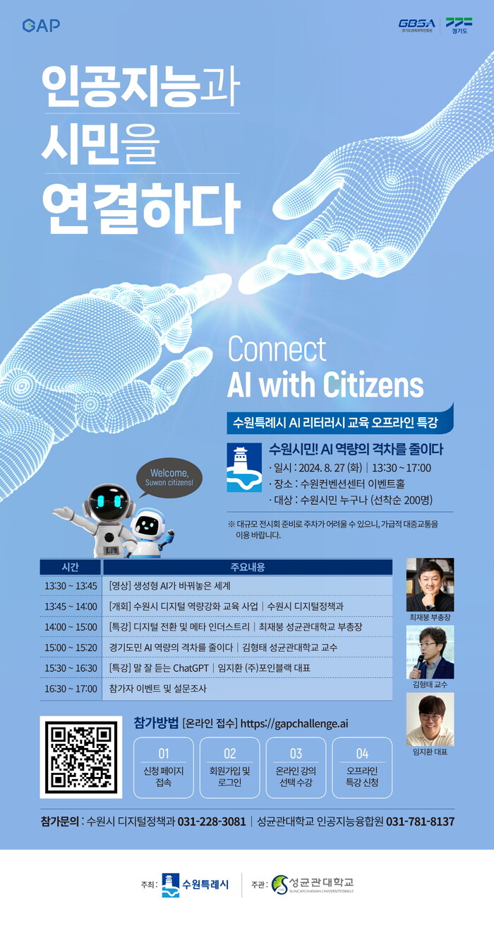 [수원=임종인 기자] 경기 수원시가 시민들을 대상으로 디지털 시대의 핵심 역량을 높이기 위해 준비한 ‘인공지능(AI) 리터러시 교육(대면ㆍ비대면)’의 수강생을 모집한다.