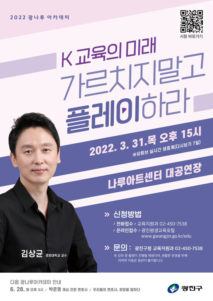 광진구 명사초청 특강인 광나루 아카데미는 김상균 경희대교수와 함께 ‘K 교육의 미래, 가르치지 말고 플레이하라’를 주제로 나루아트센터 대공연장에서 2022년의 포문을 연다.