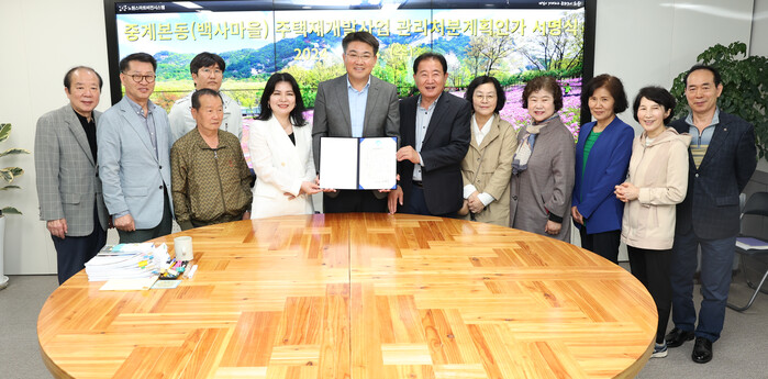 | ▲ 오승록 노원구청장(오른쪽 일곱 번째)이 24일 오전 11시 서울 노원구청장실에서 ‘백사마을 관리처분계획 인가 서명식’을 가진 뒤 기념촬영을 하고 있다. (사진=노원구청 제공) |