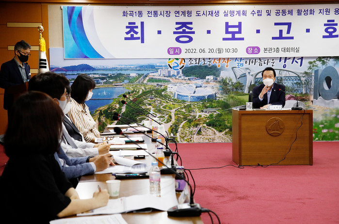 서울 강서구가 20일 ‘화곡1동 전통시장 연계형 도시재생 용역 최종보고회’를 개최했다. 보고회에서는 도시재생 방향을 다시 한번 살펴보고 도시재생 생활SOC 조성 등 향후 추진할 과제에 대한 의견을 나눴다. 사진은 보고회에서 노현송 구청장(오른쪽)이 발언을 하고 있는 모습. (사진제공=강서구청)