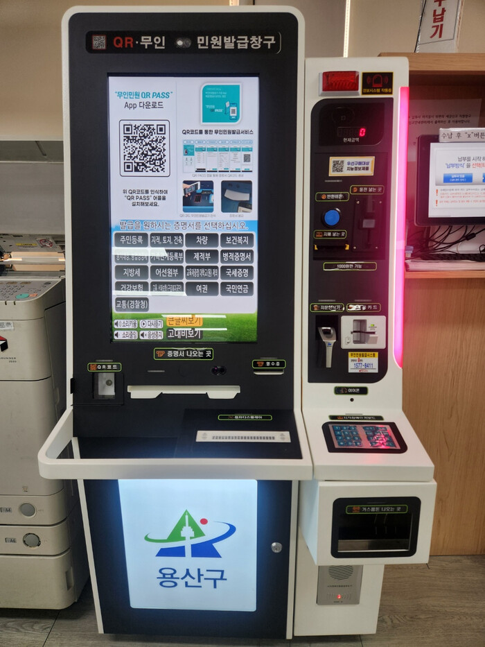 [시민일보 = 문민호 기자] 용산구(구청장 박희영)는 구민들이 보다 편리하게 민원 서비스를 이용할 수 있도록 노후화된 무인민원발급기를 새롭게 교체했다.