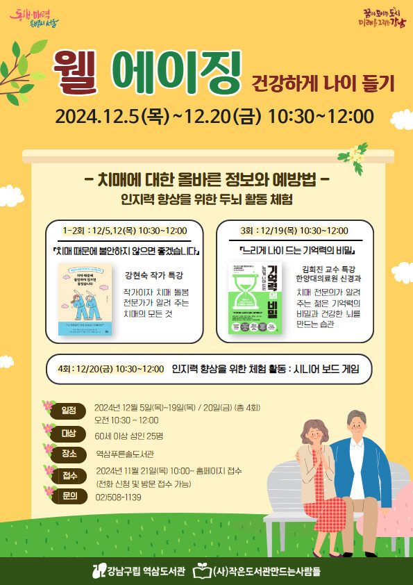 [시민일보 = 이대우 기자] 강남구립역삼도서관은 정보취약계층인 60세 이상 어르신들을 대상으로 오는 12월 5일(목)부터 12월 20일(금)까지 총 4회에 걸쳐 <웰 에이징_건강하게 나이 들기> 프로그램을 진행한다. 서울시 지원사업인 ‘동행·매력 특별시 서울’로 기획된 이번 프로그램은 한양대대학교의료원 신경과 교수이자 『느리게 나이 드는 기억력의 비밀』의 작가 김희진 교수님과 도서 『치매 때문에 불안하지 않으면 좋겠습니다』의 강현숙 작가님을 모시고 치매라는 질병에 대한 자세한 정보와 건강하게 나이들기 위한 습관에 대한 이야기를 들어볼 예정이다.