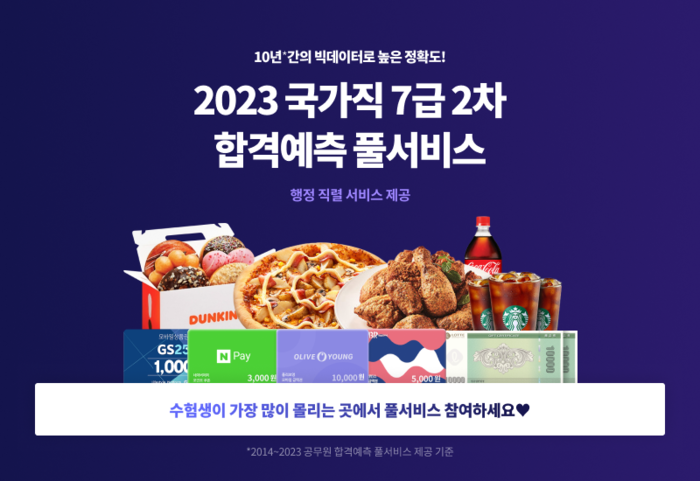 또한, 국가직 7급 2차 시험이 진행된 당일에는 ▲채점 이벤트 ▲응시표 인증 이벤트 ▲후기 작성 이벤트를 진행해 롯데상품권 2만 원권, 굽네치킨, 도미노피자, 던킨도너츠 등 다양한 외식상품권을 증정한다.