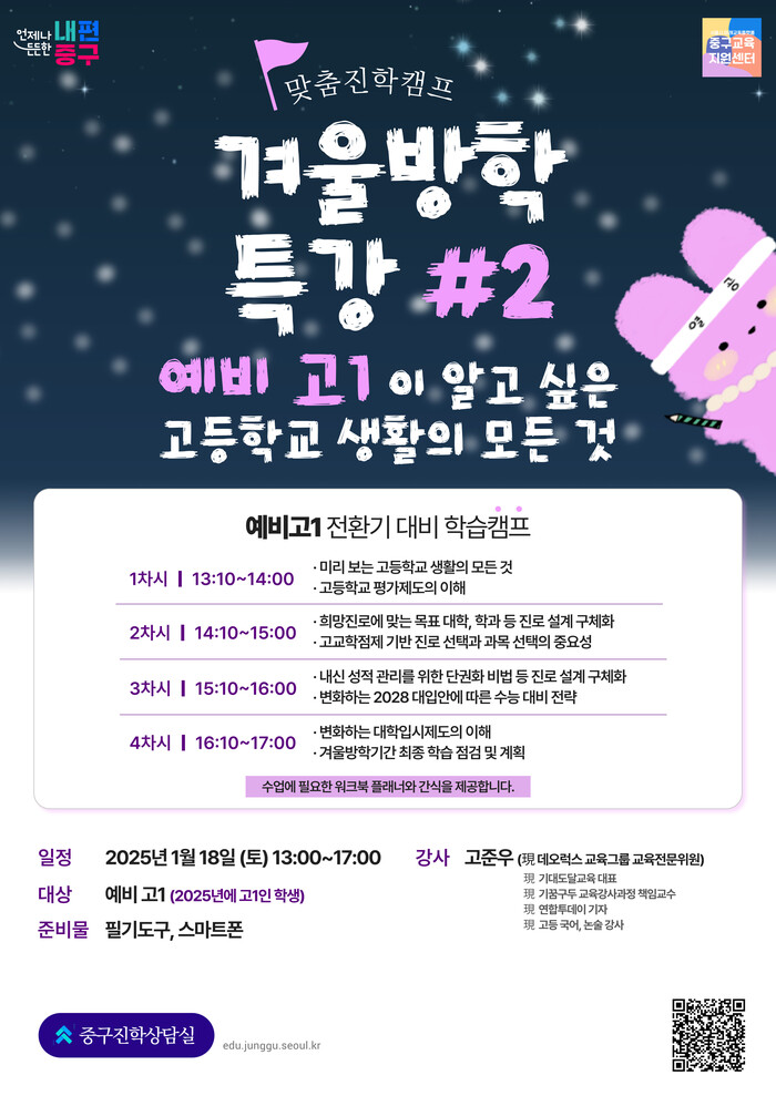 [시민일보 = 여영준 기자] 서울 중구는 예비 고1 학생들의 성공적인 고등학교 적응과 진로 설계를 돕기 위해 오는 18일 오후 1~5시 구교육지원센터에서 겨울방학 맞춤형 진학 프로그램을 운영한다고 밝혔다.