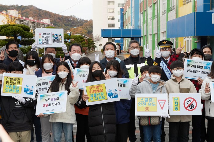 충남 아산시는 9일 온양중앙초등학교에서 유치원·초등학생 전면등교에 따른 어린이교통사고 예방 및 스쿨존 교통안전 확보를 위한 등굣길 합동캠페인과 학교주변 교통안전시설 점검 등을 유관기관과 함께 전개했다. 사진은 캠페인에 참석한 오세현 시장(뒷줄 가운데)과 관계자들이 기념촬영을 하는 모습. (사진제공=아산시청)