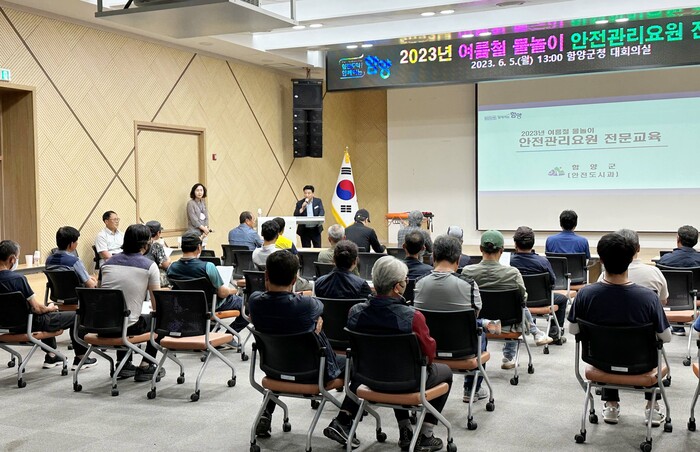[함양=이영수 기자] 함양군이 오는 8월 말까지 ‘물놀이 안전관리 대책기간’에 들어감에 따라 5일 오후 군청 대회의실에서 여름철 물놀이 안전사고 예방을 위한 안전관리요원을 전문교육을 실시했다.