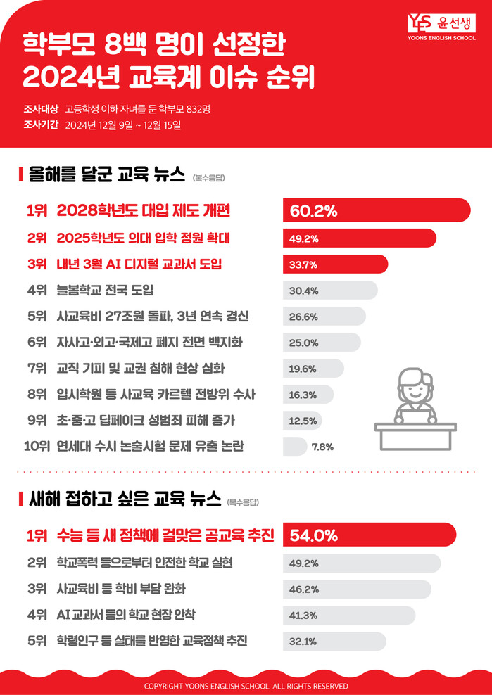 영어교육 전문기업 윤선생이 실시한 이번 설문조사는 이달 9일부터 15일까지 고등학생 이하 자녀를 둔 학부모 832명이 올해를 달군 10여 가지 교육 뉴스 중 3가지를 고르는 방식으로 진행됐다.