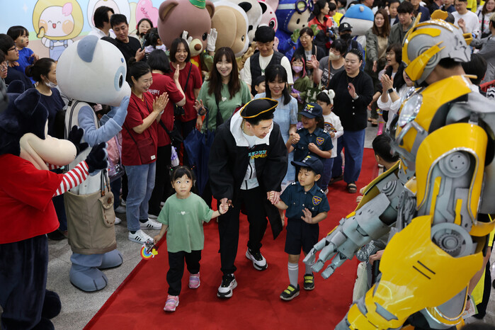 오언석 서울 도봉구청장이 어린이날인 지난 5일 도봉구청 선인봉홀에서 열린 '5♥5 도봉봉 페스티벌'에 참여해 지역 어린이들과 함께 시간을 보냈다. 사진은 오언석 구청장(가운데)이 캐릭터 옷을 입은 아이들과 함께 행진하고 있는 모습. (사진=도봉구청 제공)