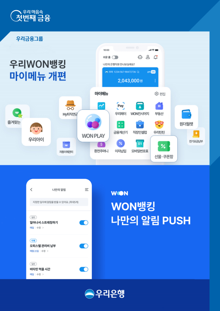 또한, 우리은행은 고객이 직접 작성한 문구와 이미지를 사용하는 우리WON뱅킹 ‘나만의 알림’을 제공한다. ‘나만의 알림’은 ‘이체알림’과 ‘일반알림’으로 구분한다. ‘이체알림’은 고객이 사전에 출금계좌, 입금계좌, 이체금액을 알림 시간과 함께 설정하면 해당일에 온 알람에 비밀번호 입력과 인증만으로 이체가 완료되는 서비스다. ‘일반알림’은 자유롭게 설정한 알림 내용을 고객이 지정한 주기마다 받아 생활 밀착형 일정 관리가 가능하다.